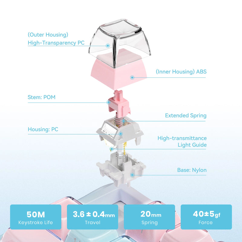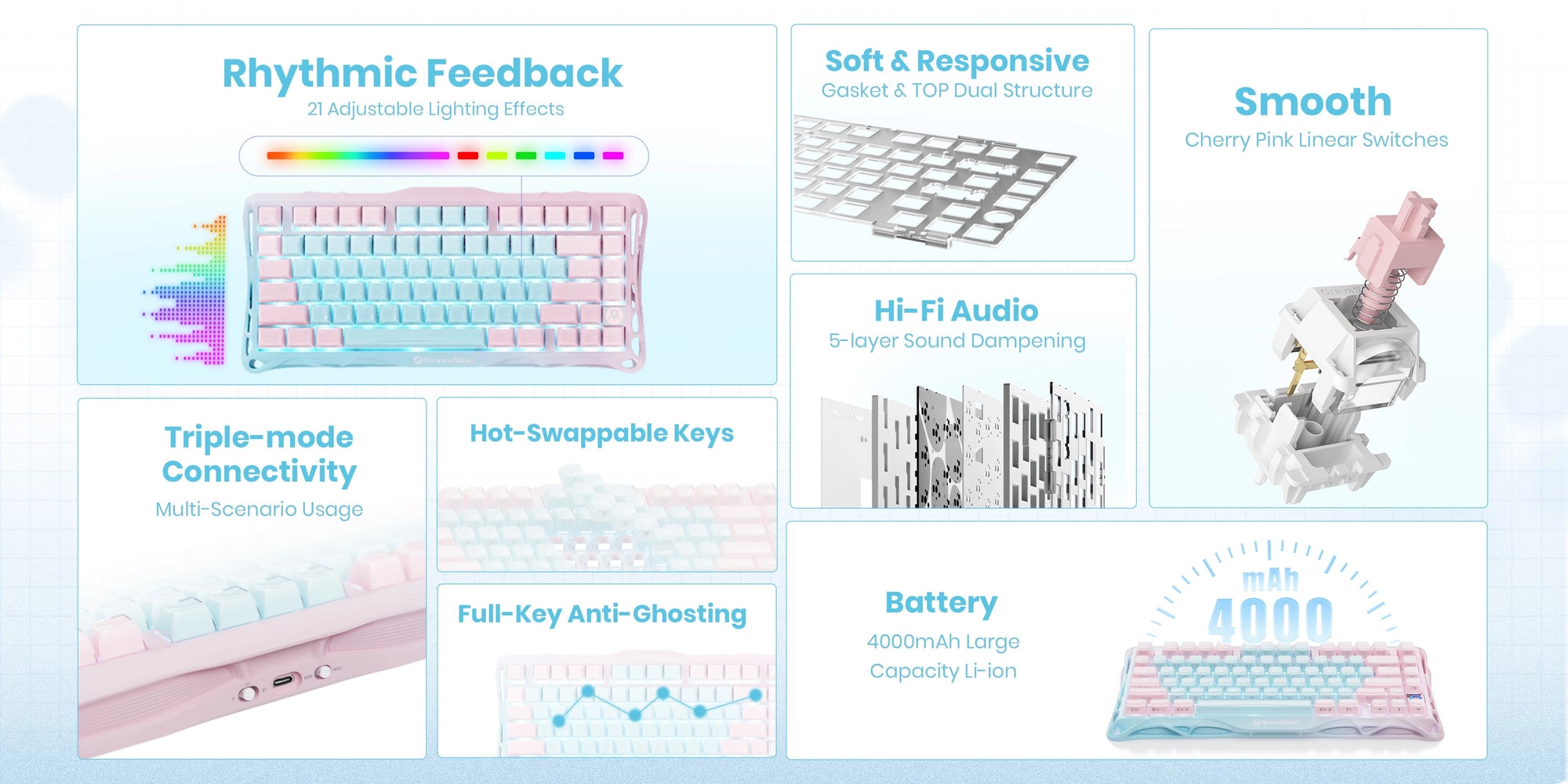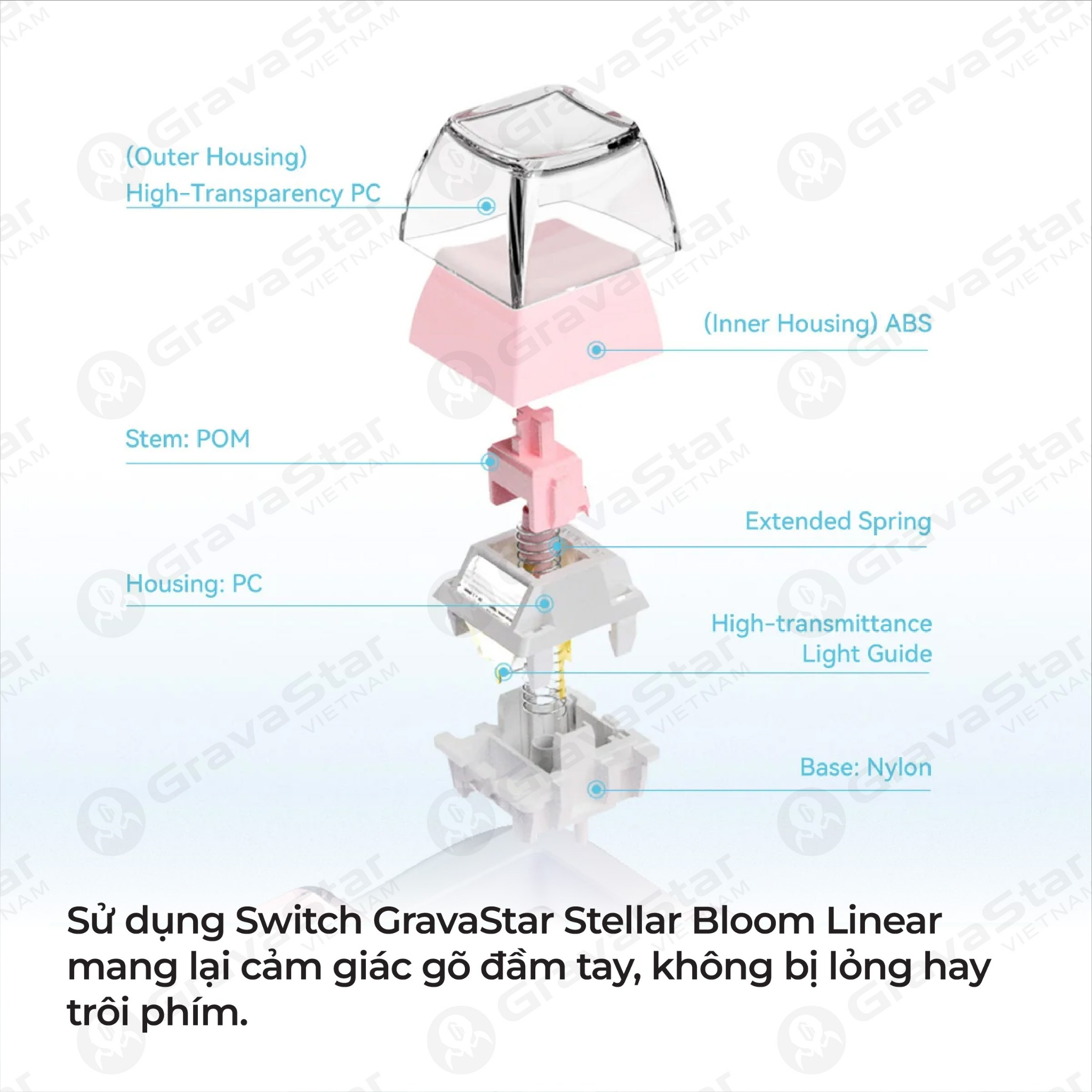 Trang bị switch Linear Custom cho hiệu năng ổn định, phản hồi nhanh. Lực nhấn nhẹ kết hợp phản hồi rõ ràng – hoàn hảo cho cả chơi game và gõ phím, không rung lắc hay cảm giác phím trôi.