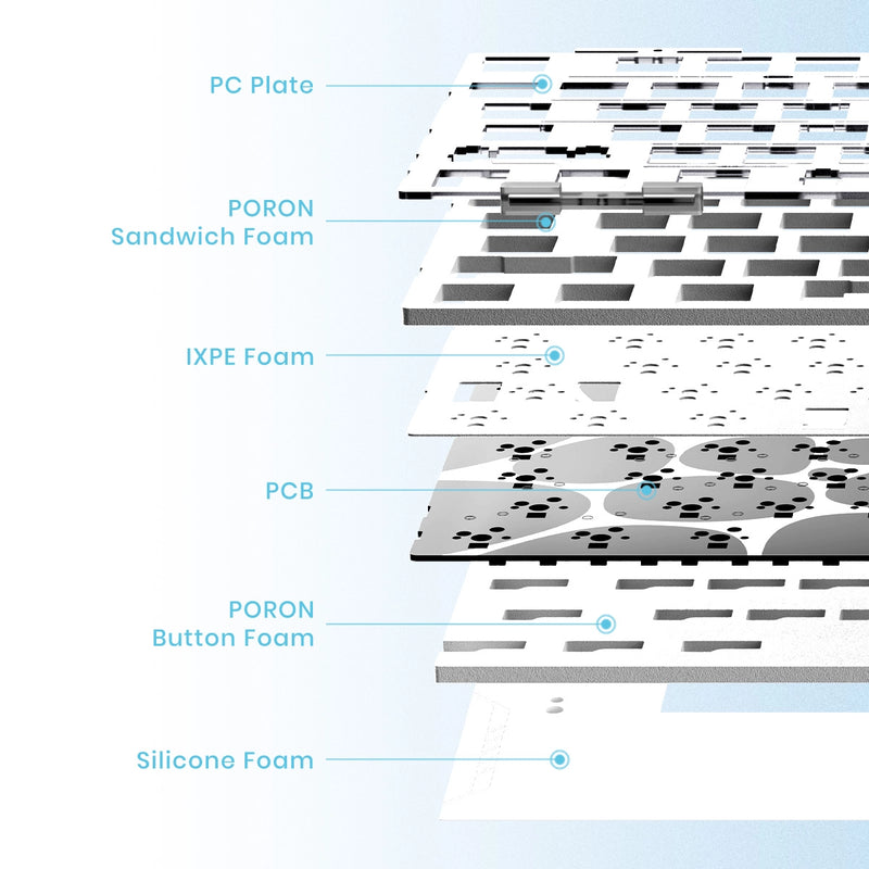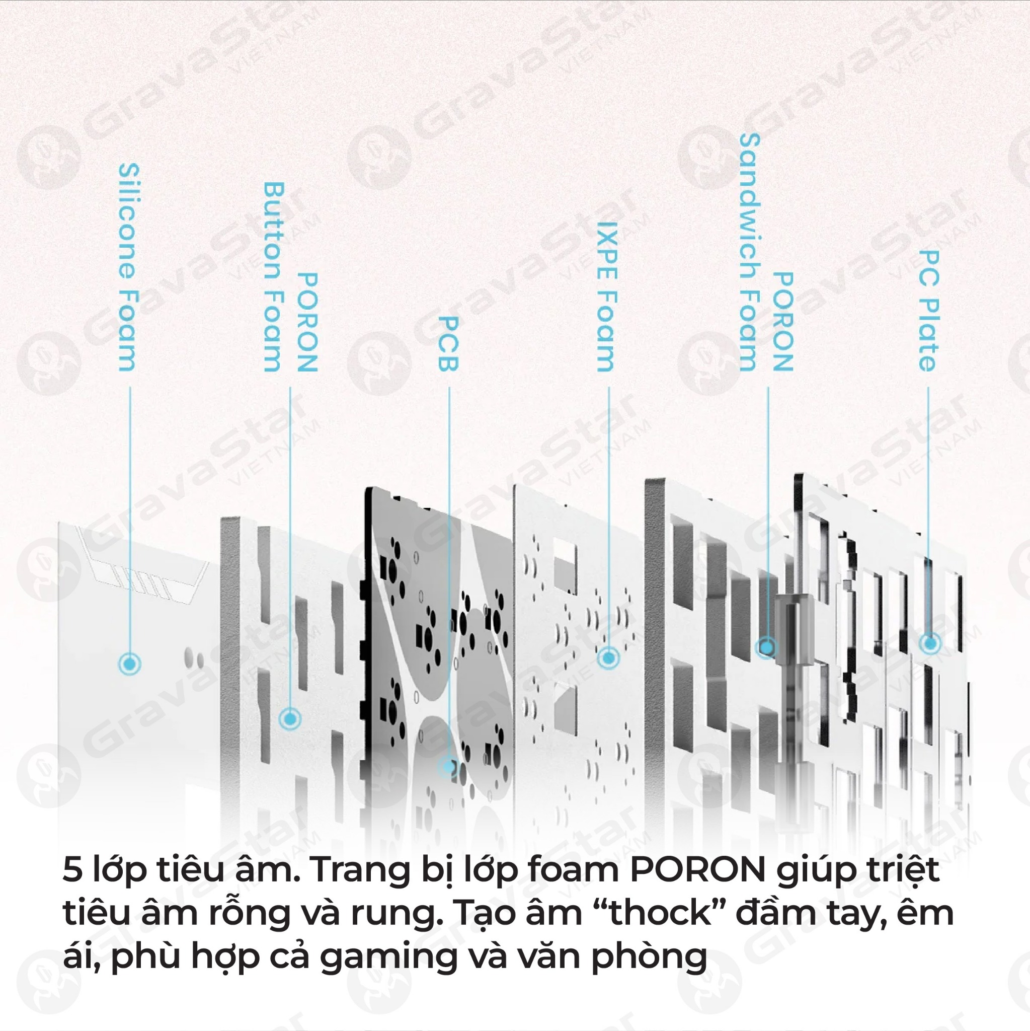 Trang bị 5 lớp tiêu âm với foam PORON giúp loại bỏ âm rỗng và giảm rung hiệu quả. Mang lại âm “thock” đầm tay, êm ái nhưng vẫn yên tĩnh, phù hợp môi trường văn phòng.