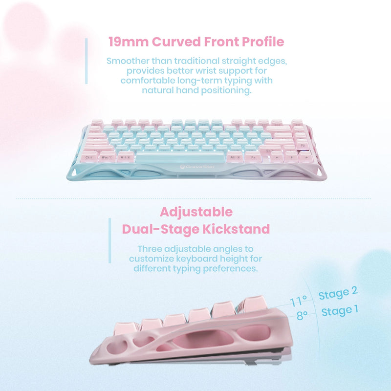 Thiết kế công thái học với cạnh trước cong 19mm giúp hỗ trợ cổ tay và đặt tay tự nhiên khi gõ lâu. Chân đế 2 nấc với 3 góc độ cho phép tùy chỉnh chiều cao theo thói quen sử dụng.