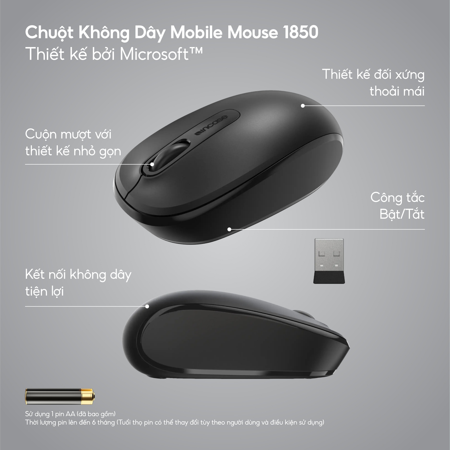 Chuột không dây Incase Wireless Mobile Mouse 1850 được thiết kế với sự tinh tế và công nghệ tiên tiến của Microsoft™, giúp mang lại trải nghiệm sử dụng mượt mà, chính xác.Thiết Kế Dành Cho Cả Tay Trái và Tay Phải