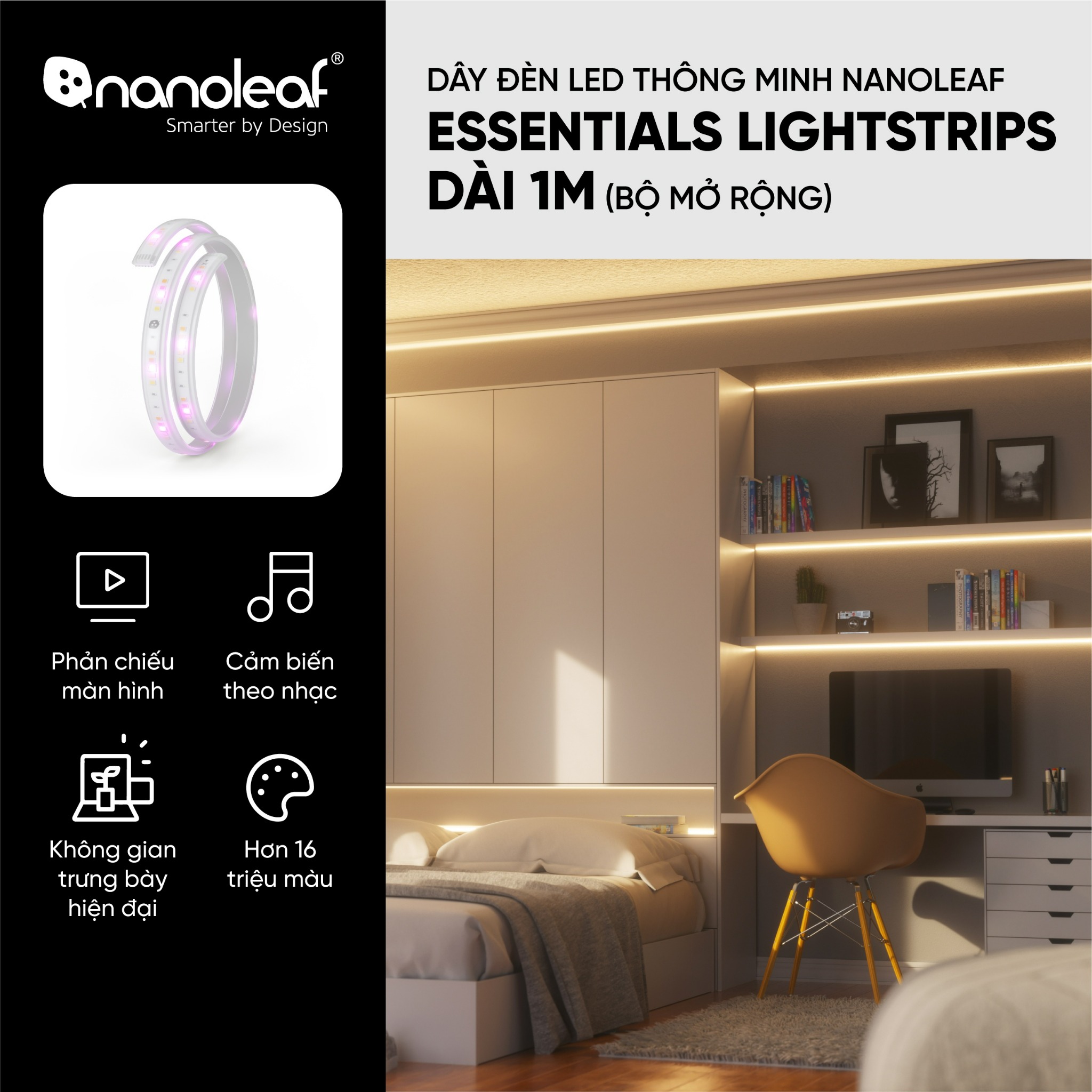- Đây là bộ mở rộng đèn dây 1m bổ sung để mở rộng cho bộ cơ bản đèn dây. Kết nối lên đến 10m mà không làm giảm độ sáng tối đa. Yêu cầu phải có bộ khởi động đèn dây Nanoleaf Essentials (tương thích với cả phiên bản hỗ trợ Matter và không hỗ trợ Matter).