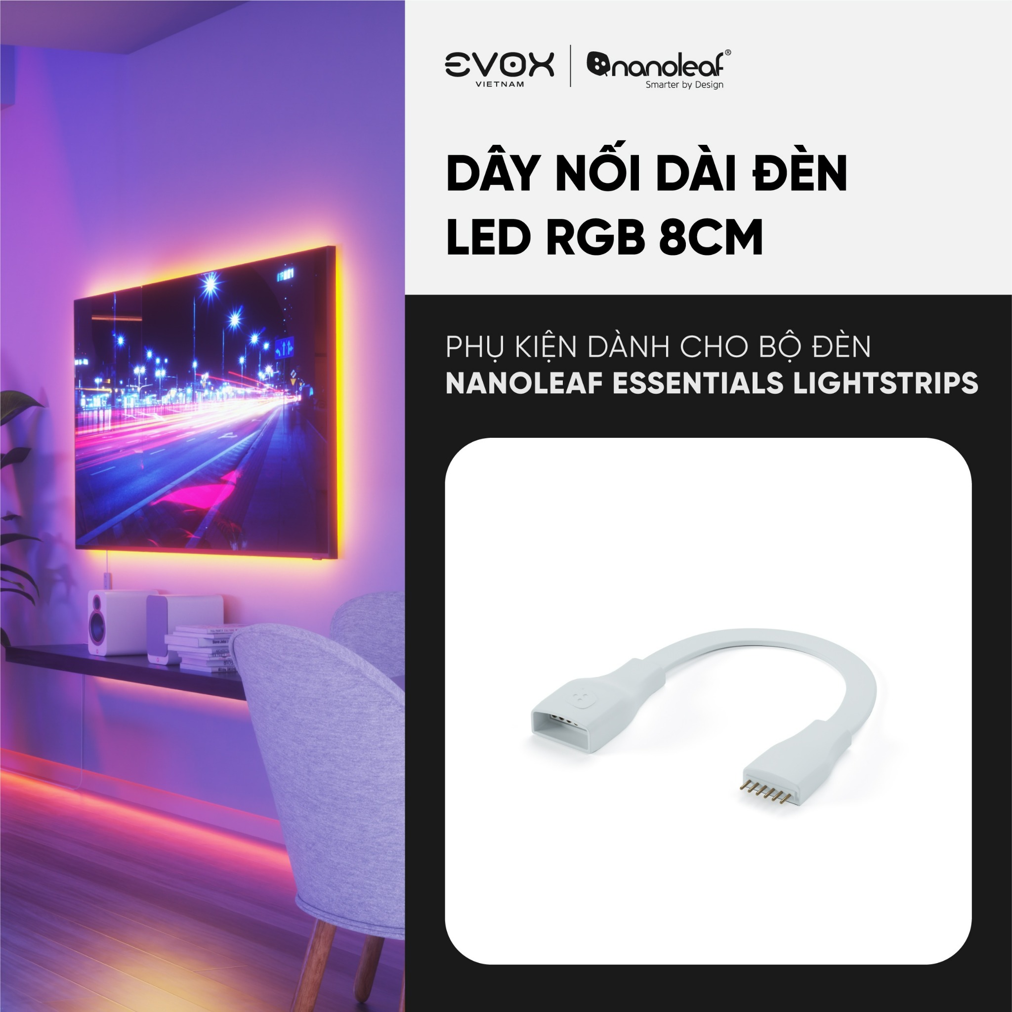 Dây nối RGB với chiều dài 8cm 1:1 sẽ phù hợp cho nối ngắn hoặc ở các góc để linh hoạt thiết kế các hình dạng cho dây đèn LED RGB thông minh Nanoleaf Lightstrips.