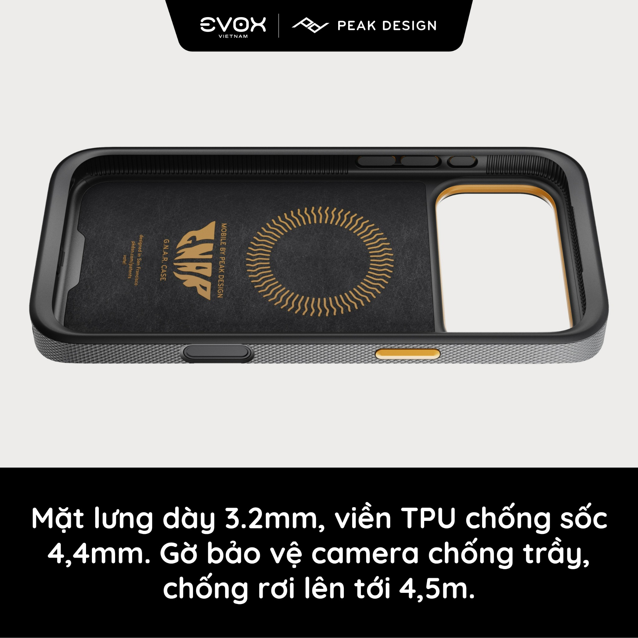 - Bảo vệ nâng cao nhưng vẫn mỏng gọn: So với Everyday Case, GNAR Case có thêm một chút đệm mút (độ dày 3.2mm so với 2.4mm), viền chống sốc TPU dày 4.4mm (so với 3.4mm), và một viền bảo vệ camera nhô cao hơn. Tuy nhiên, nó vẫn giữ được cấu hình mỏng, phẳng, cho cảm giác nhẹ nhàng trong tay và vừa vặn trong túi quần của bạn.